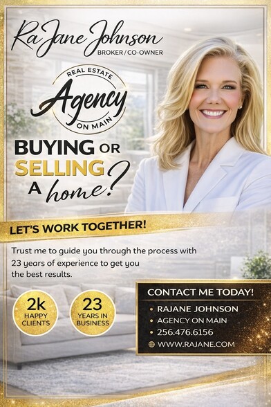 RaJane Johnson is a distinguished real estate professional specializing in Hartselle and Morgan County, North Alabama. With years of experience and in-depth market knowledge, she provides VIP treatment to both buyers and sellers, offering a seamless and comprehensive real estate experience. What sets RaJane apart is her unwavering commitment to homeownership and community impact. As the 2023 Alabama Association of REALTORS® President, she actively advocates for her clients and the real estate profession, ensuring their best interests are always protected. Her expertise in the local market, combined with her passion for real estate, allows her to deliver outstanding results. Known for her attentive listening and personalized approach, RaJane builds strong, lasting relationships with her clients. She takes the time to understand their unique needs and goals, consistently exceeding expectations and guiding them toward successful outcomes. Her dedication has cultivated a thriving business built on referrals and repeat clients who trust her to deliver exceptional service. Beyond real estate, RaJane is deeply involved in the community. She actively supports organizations like the American Cancer Society, Habitat for Humanity, Rotary, and Keep America Beautiful. A strong advocate for local education, she participates in school functions, reinforcing her dedication to Hartselle and Morgan County’s future. RaJane’s professionalism, expertise, and client-focused approach have earned her widespread recognition. In 2021, her clients voted her "The Best of the Best," a testament to her outstanding service and reputation in the industry. When you choose RaJane Johnson, you're choosing a trusted professional who will guide you through every step of your real estate journey with care and confidence. Let RaJane lead you home—you’ll never regret it.