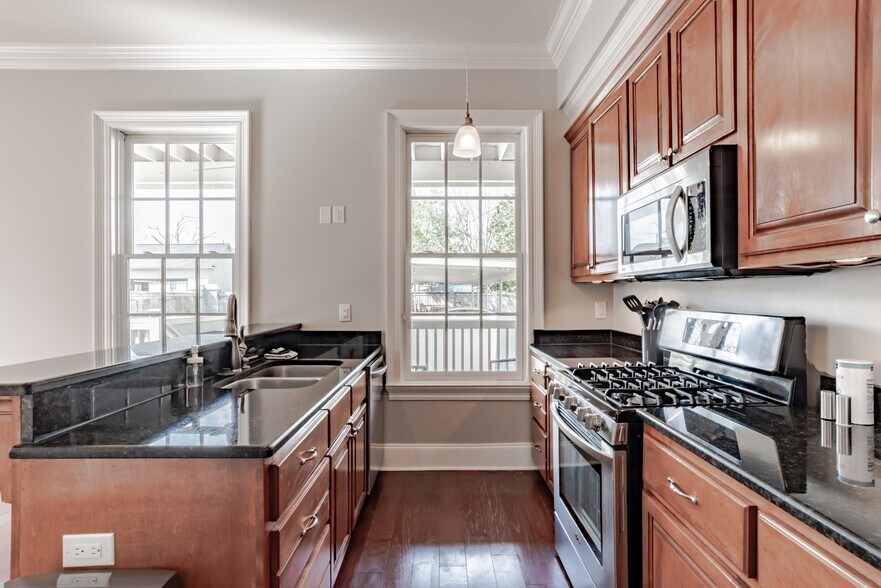 This beautiful end-unit townhome combines modern construction with the character of historic DeTonti Square. Located in one of Mobile's most walkable downtown neighborhoods, the home features hardwood floors, 10' ceilings, and an open-concept kitchen and dining area with beautiful countertops and glazed cabinetry. The living room offers a cozy gas-log fireplace, with the stove and water heater also running on gas—everything else is electric. The spacious primary suite includes double walk-in closets, a large bathroom with double vanities, and a private balcony. The second bedroom features an en-suite bath, walk-in closet, built-in office area, and a balcony with views of the RSA Tower. A separate laundry room includes cabinetry, a utility sink, and a stackable washer and dryer. Parking is made easy with 2 provided spots in a dedicated covered parking bay. This home is part of a professionally managed HOA and sits just blocks from restaurants, coffee shops, a coming boutique grocery store, Dauphin Street, and the parade route—offering the perfect blend of historic charm and modern convenience.