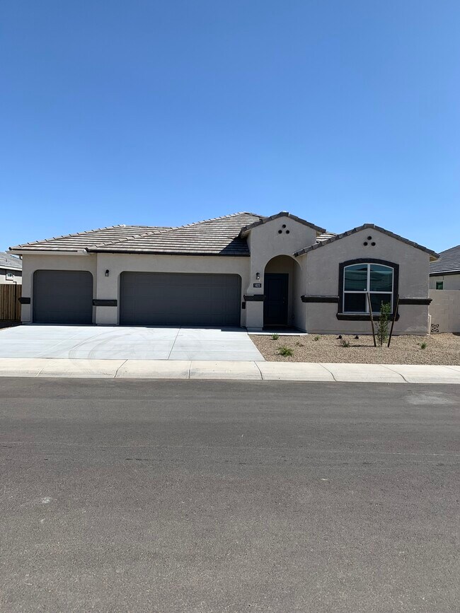 Open kitchen/great room. The kitchen boasts granite counter tops and large center island. Smart home technology is included. Stainless steel appliances, 2'' blinds, garage door openers, rain gutters, plus front & back yard desert landscape. Double Gate on side of house No back neighbors. Neighborhood of Gila Buttes! Tile floors and carpet in living room and the bedrooms. Ceiling fans in all the bedrooms. Refrigerator, washer, and dryer included. Easy maintenance backyard. Covered patio. Small dogs OK (fees & limits apply).