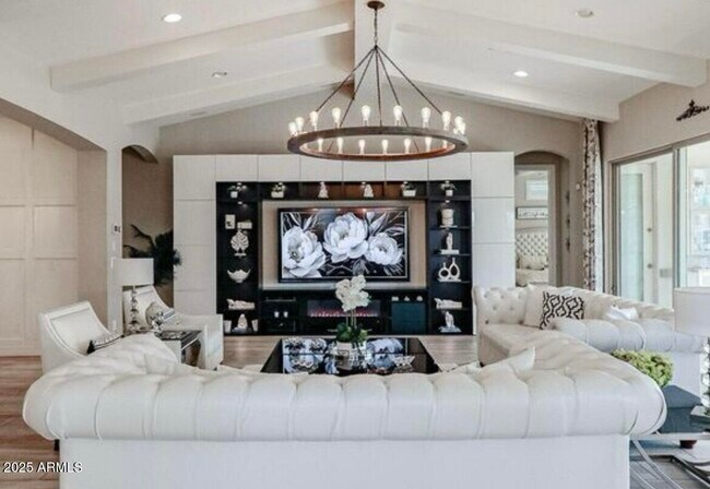 This gorgeous former Tri Pointe's corner lot model home in the gated single story community of Hawthorn Manor adjacent to the community green park features iron entry door,stainless steel Monogram appliances,painted Timberlake silk cabinets,countertop-to-ceiling backsplash extended cabinets at nook,built-in refrigerator,custom pantry,vaulted ceilings with beams,20' sliding glass door,recessed can lighting and wood windowsills throughout,18 whole home speakers,a central vacuum system,contemporary drywall texture,accent and stone walls with flex molding and trim,12x48 tiles throughout. The great room is a showstopper with an open floor plan and a custom entertainment center. This home is truly a masterpiece,offering luxury,comfort,and style in every corner.
