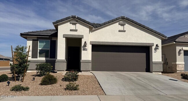 Single level 3 bedroom,2 bathroom home offering 1,924 sq ft in a lake subdivision in Maricopa. Kitchen features island,breakfast bar,gas range,pantry,built in microwave,and dining nook. Main areas include ceramic tile with carpet in bedrooms. Primary suite includes separate tub and shower,double sinks,and walk in closet. 9 foot ceilings enhance the open feel. Washer and dryer included. Fenced backyard with covered patio and irrigation system. Two car garage. Located near Copper Sky Recreation Complex,Pacana Park,and shopping along John Wayne Pkwy.