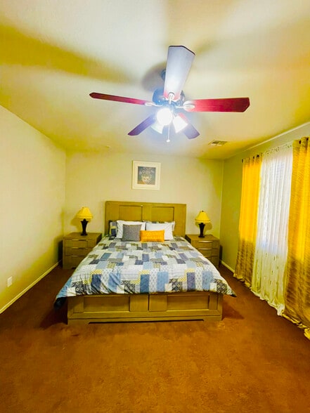 Property Id: 2385965 Spacious, fully furnished master bedroom available for rent in a shared home. The oversized room is approximately 250 sq. ft. and features a king-size bed, two nightstands with lamps, a large smart TV, and a dedicated desk for comfortable living and productivity. Enjoy a private ensuite bathroom with a large soaking tub, walk-in shower, dual sinks, separate toilet room, and a generously sized walk-in closet with ample storage. Shared common areas include the living room, dining area, kitchen, and laundry room. The home also offers a beautiful backyard with desert landscaping, outdoor tables, and chairs, perfect for relaxing. Home features and included amenities: Water softener and reverse osmosis system for safe drinking water Exterior and common-area security cameras for added safety Smart locks on all doors All utilities included: high-speed fiber internet, water, and electricity Ideal for a responsible renter seeking comfort, privacy, and convenience in a well-maintained sha