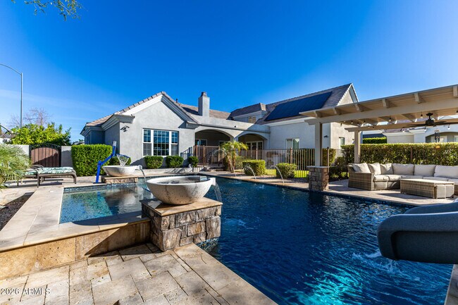 Nestled on a PRIME corner lot! This spectacular rental estate seamlessly blends timeless elegance w/modern luxury. It showcases a 3-car garage,stone accents,& professionally landscaped grounds that elevate its curb appeal. Sophisticated interior showcases clean lines that favor a sleek & functional design paired w/stylish light fixtures,wood-look flooring,ceiling fans,surround sound,bountiful natural light,& an inviting living room ideal for receiving guests. Harmonious great room is the true focal point,highlighted by a cozy fireplace that adds warmth & character. Gorgeous kitchen is a chef's delight,fully-equipped w/a plethora of cabinets topped w/crown moulding,a walk-in pantry,tile backsplash,high-end SS appliances,granite counters,& a large prep island w/a breakfast bar. Grand owner's retreat offers plush carpet,direct outdoor access,a lavish ensuite,& a walk-in closet. HUGE loft makes the perfect TV area. Venture to your entertainer's paradise,complete w/a covered patio,built-in BBQ,in-ground trampoline,pergola,& a sparkling pool. This outstanding gem has it all! MLS ID 7015154