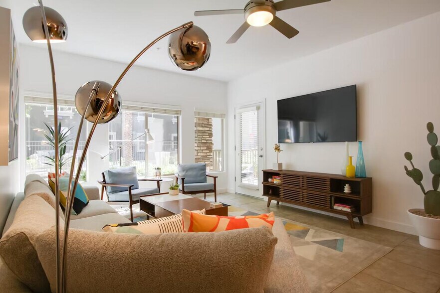 Feel at home in this bright and modern 2-bedroom, 2-bathroom vacation rental in Phoenix. This condo offers step-free access and a private patio. This vibrant condo features modern decor, a smart TV, a dining table, ceiling fans, and a furnished patio with cushioned seating. The fully equipped kitchen includes stainless steel appliances, a wine fridge, cooking basics, a Keurig coffee maker, dishware and flatware, a full knife set, a toaster, an electric kettle, and a breakfast bar with seating. You'll also have access to free Wi-Fi, linens and towels, complimentary toiletries, central air conditioning and heating, in-unit laundry machines, laundry detergent, and hair dryers. Enjoy the gated community with a pool, hot tub, tennis court, and gas grills. Parking is available with 2 designated spots in the community parking garage for 2 vehicles. Enjoy easy access to the best of Phoenix, with Piestewa Peak Park, the Arizona Boardwalk, and TPC Scottsdale all within easy reach. This property is located in an adult community and is not suitable for children. No smoking, pets, events, parties, or large gatherings are allowed. Additional fees and taxes may apply, and a photo ID may be required upon check-in. [SI]