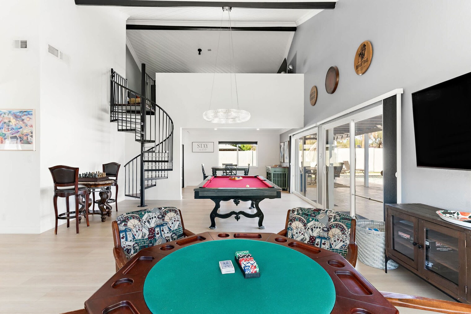 Welcome to your ultimate Scottsdale getaway! Feel at home in this stunning 4-bedroom, 2-bathroom home that accommodates up to 10 guests and is designed for relaxation and entertainment. The highlight of this property is the resort-style backyard, featuring a rock waterfall with a slide, a spacious outdoor bar, and plenty of room to lounge and play. The chef's kitchen is fully stocked with high-end stainless appliances, a large refrigerator, ample cabinetry, a drip and Keurig coffee maker, and a wet bar. The living room features a smart TV and a large plush sofa. Enjoy outdoor amenities such as an outdoor patio/dining area, a BBQ grill, corn hole, basketball hoops, and poolside loungers. The game room includes a pool table, poker table, chess board, and a smart TV. The heated private pool is available for $125 per night, and it is recommended to heat the pool between October and May each year. At least a 3-day notice is required before your arrival if you'd like the pool heated, and the pool must be heated for the entirety of your stay. Up to 2 dogs are allowed for $125 per stay. Ideally located near top attractions, dining, and shopping, you'll have the best of Scottsdale at your fingertips! Nearby attractions include McCormick-Stillman Railroad Park, Pinnacle Peak Park, Scottsdale Quarter, Old Town Scottsdale, Butterfly Wonderland, and Taliesin West. Enjoy nearby restaurants such as Fire At Will, Hush Public House, Ocean 44, Cala Scottsdale, Fat Ox, and Roaring Fork. Check-in is at 4pm and check-out is at 10am. No parties are allowed, and violations may result in immediate termination of the stay. Guests must be 25 years or older to book this property. For families with young children, a removable pool fence is provided that easily plugs into the ground—no tools required! An exterior camera is installed solely to monitor the cleaning team for quality and security purposes. Parking is available in the driveway for a maximum of 4 cars. We kindly ask that your dog is crate trained and that you pick up after your dog. [SI]