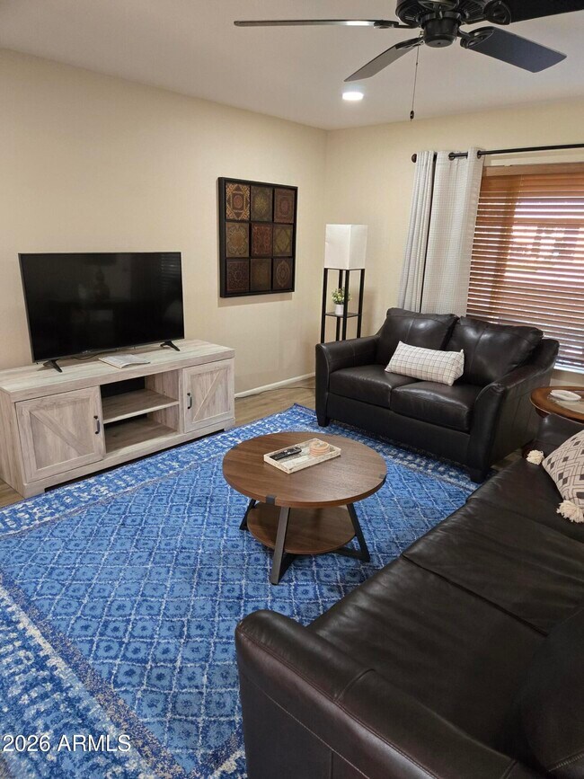 Available starting April 3rd,2026 King bed in the primary. Fully furnished rental home including dishes,linens and furniture. New tile shower,new tile floor,faucets,new sinks,Sparkly White Quartz counters in kitchen and bath,new tile herringbone backsplash,new lighting inside and outside. new interior doors and hardware. New 50 inch LG TV in the living room. New paver patio in front and covered patio in back overlooking greenbelt and citrus trees. Flooring is wood look tile throughout and carpet in the bedrooms. AC new 2022,Bedrooms have King and Queen beds. Living room has leather sofa,loveseat. Sun City is the original Sun City with 7 Rec Centers and 8 golf courses. Attached garage is 1.5 spaces wide. First floor,no stairs,slider to grassy backyard and covered pati