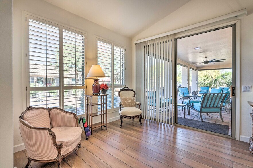 Feel at home in this single-story, 3-bedroom, 3-bathroom house in the 55+ Sun Lakes community. This serene home offers an inviting living space. This vibrant and well-appointed home features 3 smart TVs with cable, a dining table, ceiling fans, books, an office, and 2,300 sq ft of living space. The fully equipped kitchen includes an island with seating, a wine cooler, a Keurig coffee maker, a blender, a Crockpot, a toaster, cooking basics, dishware and flatware, and an ice maker. You'll also find a washer and dryer, linens and towels, an iron and board, hangers, trash bags, and paper towels. This home is pet friendly with a $75 fee for up to 2 dogs. Driveway parking is available for 2 vehicles, and garage parking is available for 2 vehicles. Explore Old Town Scottsdale, enjoy dinner at Stone & Barrel, and meander back to your home-away-from-home to unwind by the outdoor fireplace to stargaze. This property is located in a 55+ only community, but children are allowed to visit. Smoking, events, parties, and large gatherings are prohibited. Guests must be at least 55 years old to book. A photo ID may be required at check-in. Includes laptop-friendly workspaces. [SI]