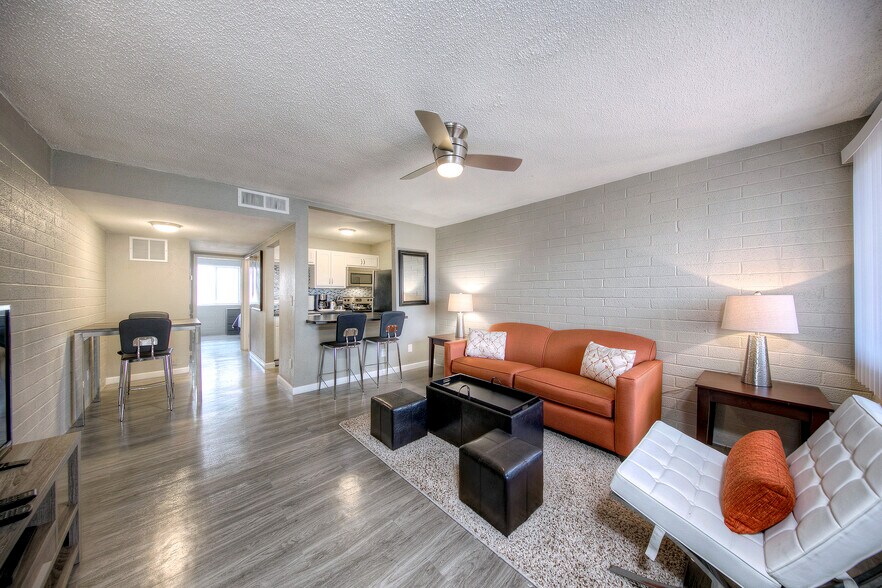 A beautiful lower remodeled one bedroom and one bath with parking. * Super nice quiet 22 unit - 2 story building * Bright and airy living room * 2- tone grey laminate flooring throughout * Large picture window that brings in lots of natural sunlight. * Central Air & Heat * Unique dining area * Designer ceiling fans * Kitchen with white cabinets * Dark grey laminate counter tops * Kitchen includes: Stainless steel stove, refrigerator, dishwasher and microwave * Bedroom with spacious closet * Full shower/tub with white vanity and track lighting * One dedicated parking space. * Guest parking available * Laundry on site * Pool * Pets are welcome with monthly pet rent and pet deposit. AVAILABLE FOR MOVE IN NOW! Ideal location will place you within easy access to the ASU campus and Tempe Marketplace that offers more than 100 shops, restaurants, and nightlife. Property has a sparkling pool, onsite laundry, trash collection service, and lots of parking.