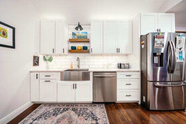 Steps to future Walmart Home Office location, BHS, Sams Club Headquarters and Rt.71. There's no freedom like seeing the world on 2 wheels, and Bentonville offers an ideal destination for both urban and mountain bike enthusiasts! Resting on a trail that'll lead you to the city's best attractions, this 4-bedroom, 2-bath vacation rental places you in the heart of the action and comes well-equipped with all the modern essentials. After a full day of riding, sightseeing, shopping, and dining, return to your new home-away-from-home and relax with loved ones. Private Patio/Yard | 2,600 Sq Ft | Chic Interior Design With easy access to the Razorback Greenway and Slaughter Pen Trail, this home is perfect for families or groups of cyclists looking to explore Northern Arkansas. Master Bedroom: King Bed | Bedroom 2: Full Bed | Bedroom 3: Twin Bunk Bed | Bedroom 4: Full Bed MAIN FEATURES: 2 living rooms, fireplace, Smart TVs, dining table, contemporary furnishings & decor, utility room w/ iron, ironing board, washer & dryer, shower/tub, en-suite bath w/ dual-sink vanity & walk-in shower KITCHEN: Spacious & fully equipped, stainless steel appliances, Keurig coffee maker, blender, serving trays, cooking spices, essential cookware, dishware, glassware, silverware OUTDOOR SPACE: Furnished patio w/ shade umbrella, fenced yard, cozy covered front porch GENERAL: Free WiFi, central heat & A/C, ceiling fans, linens & towels, hair dryers, basics like toiletries, trash bags, etc PARKING: Garage (1 vehicle), driveway (2 vehicles)