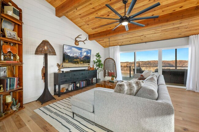 Eagle's Bluff is the ultimate resting spot for anyone looking to get away from it all! Located on Beaver Lake, this home offers sweeping views of the lake and the Ozark Mountains. Looking to get out on the water? Travel less than a mile down the road to War Eagle Marina to swim or dock a boat. If you'd like a close-up view of the lake, a marked nature trail is available for your enjoyment. This cozy home is flooded with natural light and boasts beautiful sunset views. It can sleep up to 12 guests with 7 luxury beds, a fully stocked kitchen, two spacious living rooms, and an 1800 square foot double-decker patio with ample furnishings and amenities including a third deck with seating. This home is owned and designed by an in-house interior designer and no detail is spared! The home features sweeping views of Beaver Lake and the Ozark Mountains from all levels. It is 0.8 miles from War Eagle Marina and 9.5 miles from Downtown Springdale. The home sleeps up to 12 guests with eight luxury beds, including 3 King-size beds, 2 Queen-size beds, 2 Twin beds, and 1 Queen pullout. The fully stocked kitchen includes high-end appliances and a Keurig. The main living room has huge windows overlooking the lake, while the second basement living room offers seating, a kitchenette, and a bar area. Board games, card games, and puzzles are available, and the home is kid-friendly with a Pack 'n Play and Baby Stair Gate. The large, double-decker patio includes a BBQ grill, plenty of seating, a dining table, and a porch swing. A fully equipped laundry closet is available for guest use, and fresh towels and linens are provided. There is plenty of parking in the driveway, including a covered carport and a 2-car garage, all available for guest use. This property is not pet-friendly. On-street parking and parking in front of the driveway leading to the home below are not permitted. The nearest beach is at War Eagle Marina, just 0.8 miles down the road. There is also a marked nature trail by the neighboring blue house that leads closer to the water, with picnic tables and benches along the way. The trail can be steep in some spots. Access to the closest boat ramp is War Eagle Marina, access to the nearest gas station and grocery store is Hometown Country Store (5.5 mi), and access to the nearest liquor store is Fiesta Liquors (9.5 mi). Check-in is any time after 3:00 PM. No parties or events are allowed unless pre-arranged with the host and the event fee has been paid. If an unapproved party or event is discovered, you will be fined $1000. Pets discovered at the property will incur a fine of $400. Unauthorized checkout delays will incur a fine of $100 per hour. This is a non-smoking home. If you smoke in the home, you will be fined $1000 plus the cost of any smoke remediation necessary. Quiet hours are between 10:00 PM and 10:00 AM. [SI]