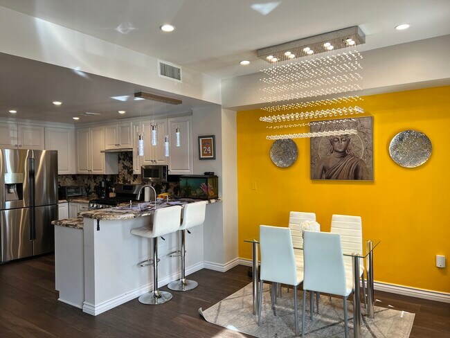 Kitchen and dining area with a beautiful modern chandelier