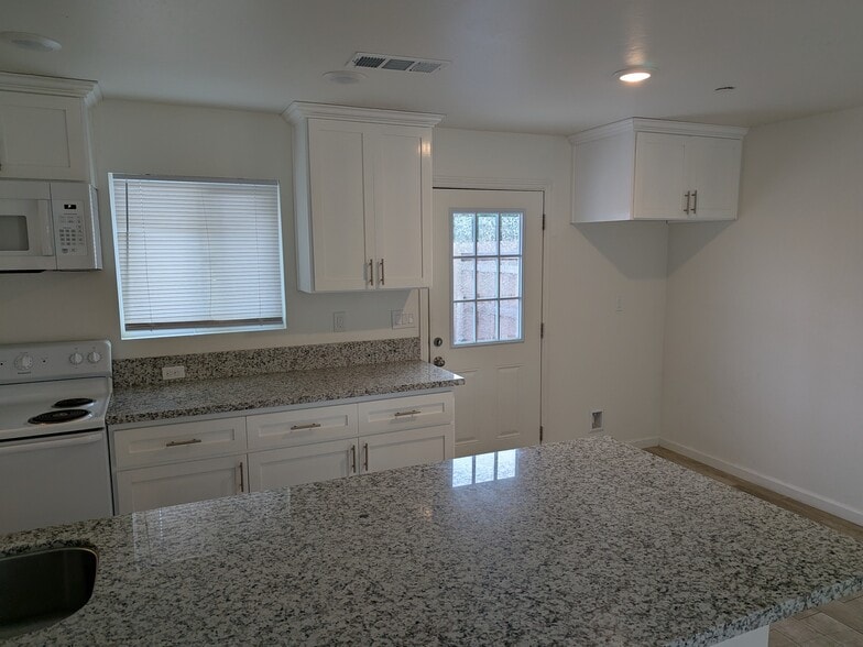 TWO YEARS NEW WITH SOLAR! Don't miss out on this super low rent for 3 bedroom unit in excellent condition. Granite counters in kitchen an bathroom, laundry room just off kitchen area, ample off street parking. This unit is at the front right next to the parking area for convenience. Pets case by case with pet rent added, very large private patio, this 3 unit gem is located in a decent area between 2 owner occupied homes!