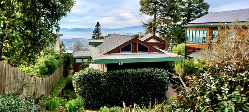 This wood paneled house built for a famous Berkeley pianist has a huge living room and deck on a mostly level lot with views of the SF bay. It retains much of its original personality with a mature garden, privacy and quiet. It has huge windows throughout and is exceptionally luminous. It features a practical kitchen, upgraded full bath, two medium bedrooms and one small bedroom / study.