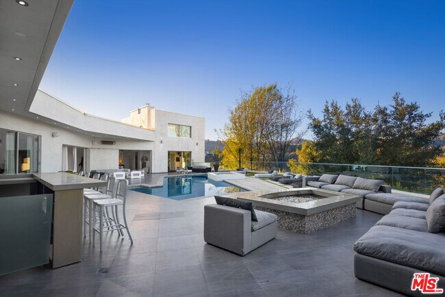 This property is available for short-term and long-term rentals, each with its respective pricing options. It is fully furnished, decorated, and equipped with hotel-like essentials and amenities. With our concierge team available to assist 24/7, this home rental offers a five-star hospitality experience, whether you are staying for a few days, a month, or a year.This magnificent gated compound, perched at the top of a long private driveway, features a contemporary style with a 60-foot pool, sports courts, and a 20-car motor court. The home boasts eight generous bedrooms and seven full bathrooms, each with high-end furniture, plush bedding, and luxurious finishes. The primary suite, located on the first floor, includes an adjoining massage room, a large office, and direct access to the pool. The house offers high ceilings, Fleetwood glass walls, and a gourmet kitchen with professional-grade appliances. The expansive outdoor area features a cabana with a fire pit and bar, a putting green, a private pool and spa, and a half basketball court, all overlooking the canyon with spectacular views.