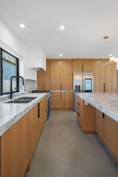 1200 square feet of living space and 3BR 2BA including a luxe primary suite with free standing tub. Gorgeous kitchen with white oak cabinets and Brazilian quartzite stone, all new top end appliances including professional range and smart fridge, and large kitchen island. White oak trim, doors, and built-ins throughout the home contrast nicely with polished concrete flooring. Utility room with laundry and extra storage. Huge windows throughout create a light and bright atmosphere, and the design maximizes privacy in every room.