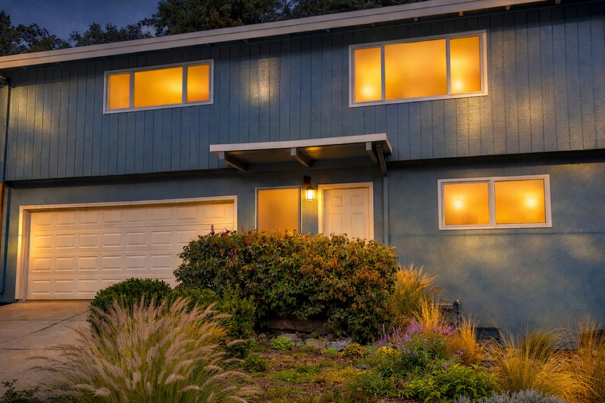 Step inside to fresh interior paint and brand-new carpeting throughout, along with newly installed dimmable ceiling lighting that gives the whole place a clean, move-in-ready feel. Downstairs, large windows fill two inviting bedrooms with natural light, and a two car garage. Upstairs, the vaulted-ceiling living room flows into the kitchen, with plenty of counter space and storage for everyday meal prep and casual gatherings. The adjoining dining area opens to your outdoor oasis an ideal Marin-climate space to relax, entertain, and al fresco dining.