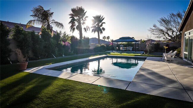 Desert Oasis Awaits: Your Private Resort Playground in Indio Indulge in the ultimate desert escape at this stunning newly built home, designed for resort-style living. This open-concept masterpiece boasts four spacious bedrooms, three luxurious bathrooms, and a large, light-filled sunroom – perfect for additional relaxation or a dedicated hobby space. Step outside to your private paradise. A massive backyard awaits, complete with a sparkling swimming pool, a shaded gazebo featuring a fully equipped outdoor kitchen, and a putting green to challenge your short game. Imagine cooling off in the pool after a day exploring, grilling up a feast under the desert stars, or practicing your putt – all within the comfort of your own home. The master suite is a haven of tranquility. Unwind in the massive deluxe shower, then slip into your comfy clothes from the huge walk-in closet. With direct access to the resort-style backyard, you can seamlessly transition from indoor relaxation to outdoor fun. This entertainer's dream home offers endless possibilities for family fun and unforgettable gatherings. The expansive backyard provides ample space for children to play freely, while adults create lasting memories under the desert sun. Location is key! This home is conveniently situated blocks away from Richard Oliphant Elementary School, with a short 3-minute drive to Desert Ridge Academy (Middle School) and Shadow Hills High School. Embrace the active Coachella Valley lifestyle. With over 120 golf courses nearby, golfers will be in paradise. For the equestrian enthusiasts, the home offers closer proximity to Empire and El Dorado Polo Clubs. And when it's time to immerse yourself in the valley's vibrant music scene, the world-famous Stagecoach and Coachella festivals are just a stone's throw away. This home is more than just a place to live – it's a lifestyle. Contact us today to start creating memories in your own private desert oasis.