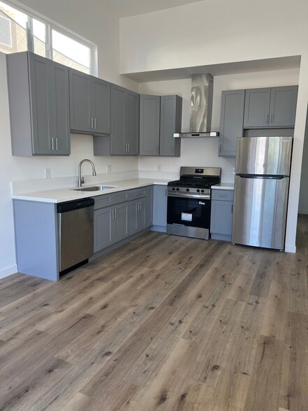 Modern kitchen with brand new refrigerator, stove, and dishwasher included