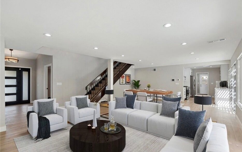 Experience refined living in this beautifully reimagined residence in Irvine's highly coveted Westpark community, located within the award-winning Irvine Unified School District and University High School boundary. Thoughtfully renovated from top to bottom, this exceptional 5-bedroom, 3.5-bath home blends timeless elegance with modern comfort in one of Orange County's most desirable neighborhoods. Bathed in natural light, the home showcases soaring vaulted ceilings, sophisticated new finishes, and a highly desirable main-level guest suite complete with a private ensuite bath ideal for multigenerational living, guests, or a private home office. Every detail has been carefully curated, with brand-new appliances, fixtures, and finishes throughout. Designed for both everyday luxury and effortless entertaining, the home features a welcoming mudroom/laundry area off the attached two-car garage, which includes an EV charging outlet. Outdoors, a private resort-style backyard offers mature landscaping, a shaded pergola, and a heated pool, creating the perfect setting for year-round enjoyment. A dedicated exterior access point with adjacent powder bath adds exceptional convenience for poolside living and entertaining. Upstairs, four additional bedrooms include a spacious and serene primary suite with vaulted ceilings, a private ensuite bath, and dual closets enhanced by floor-to-ceiling storage. The secondary upstairs bath has been beautifully refreshed with a brand-new tub, designer fixtures, and crisp white tile surround. For year-round comfort, the home is equipped with central heating and newly installed central air conditioning. Perfectly positioned with convenient access to the 405 Freeway and John Wayne Airport, this residence is also moments from Westpark Plaza and The District at Tustin Legacy, offering premier dining, shopping, entertainment, Whole Foods, AMC Theatres, and top fitness destinations including LA Fitness, Orangetheory, and Planet Fitness. Residents enjoy access to Westpark's outstanding community amenities, including tennis courts, basketball courts, lap pool, scenic walking and biking trails, and beautifully maintained parks.