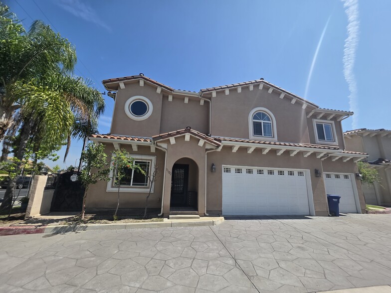 The home includes 10-foot ceilings and wood flooring throughout the living and dining areas. The oversized kitchen opens to a welcoming family room with a fireplace and direct access to a paved backyard and patio. Additional features include a three-car garage plus guest parking. All bedroom is upstairs including a large primary suite with dual sinks and a jacuzzi tub, along with two additional en-suite bedrooms and an office. Each bedroom features a private bath and large closet. A second-floor laundry room adds convenience. There is a fully bath downstair.