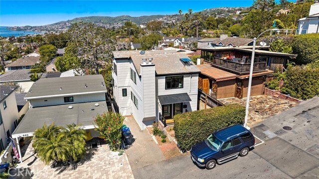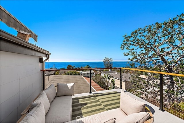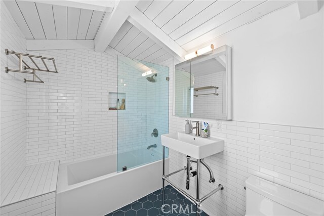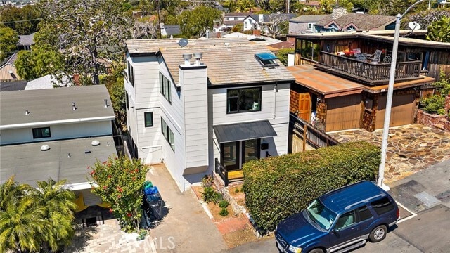Modern bungalow just a few blocks to the beach in one of Laguna Beach's most desirable neighborhoods - Woods Cove. This completely remodeled and upper level unit features a bright and airy living room with ocean views and convenient kitchenette with butcher block counter and tile backsplash, refrigerator, sink with garbage disposal, and countertop convection oven, vaulted open beamed ceilings, wood floors, dreamy ocean view bedroom, sleek bathroom surrounded in stylish white subway tile, shared outdoor laundry, and stunning roof top deck with electric awning perfect for alfresco dining with fabulous ocean views all the way up the coast of Laguna Beach. Just a few blocks to some of the finest beaches and coves in the Village or just relax and enjoy the Catalina Island sunsets from home! Free trolley service running every 30 minutes nearby, no car needed! However, there is a dedicated off street parking space and ample street parking for guests. Absolutely ideal location with charming shops and the top rated restaurants and bars of Laguna all within walking distance. MLS# LG25236822
