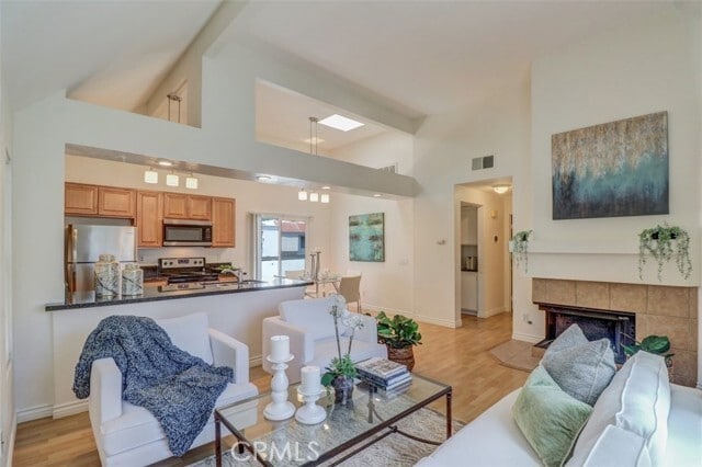 This 2-bedroom 1 3/4-baths condo features a carriage unit style with no one below you, an open and bright floorplan with cathedral ceilings, cute kitchen with upgraded countertops and appliances, inside laundry, and laminate wood flooring throughout. November 2016 - all new appliances, kitchen cabinets, and bathroom vanities, complete Pecs re-pipe January 2018 - new 40 gallon water heater; permitted March 2018 - new double pane vinyl windows throughout July 2020 - new central A/C energy efficient 14 Seer HVAC system; permitted. Enjoy a beautiful association pool, spa, and sauna. Walking distance to Starbucks, shopping center, parks, restaurants, and hiking trails. Close to excellent schools in the Capistrano Unified School District. MLS# OC26006848