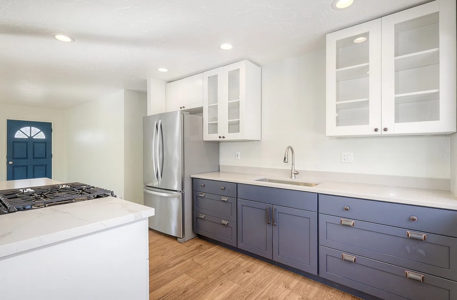 Front home features 3 bedrooms and 2 full bathrooms, along with a remodeled kitchen showcasing quartz countertops, upgraded cabinets, pergo flooring, and a deep farmhouse sink. The home offers 1,254 sq. ft. of living space, plus a private and spacious backyard with a covered patio, fruit trees, lifetime sheds, and wall A/Cs. The 2-car garage has been converted into two separate rooms, offering approximately 420 additional sq. ft. of flexible space that can be used as an extra bedroom, office, or storage. Washer, dryer, and refrigerator are included. Driveway parking is shared with the back unit. Conveniently located next door to beautiful Berry St. Park.
