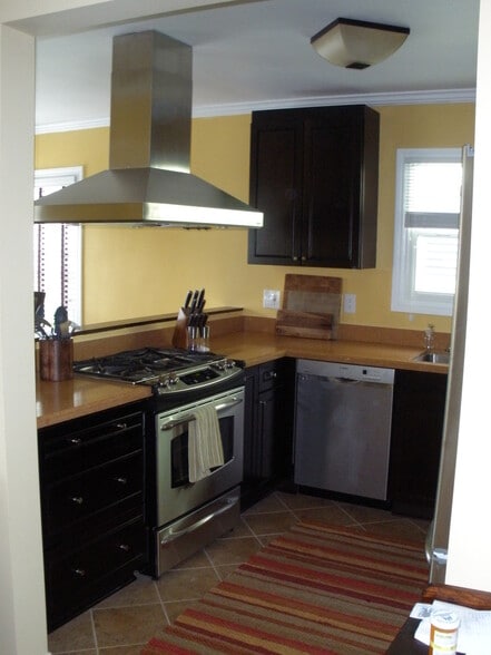 This large top-floor corner with one bedroom enjoys a spacious 756 square feet. Amenities include a private laundry, central heat and air conditioning, a huge walk in closet, separate dining area, chefs kitchen with high end GE Profile appliances, a professional size range hood over the gas stove, dishwasher, quartz countertops, real wood cabinets with soft close drawers, dual pane windows, newer contemporary window blinds and light fixtures, a Kohler tub and commode with stone floors and yiled walls of the bathroom and kitchen.
