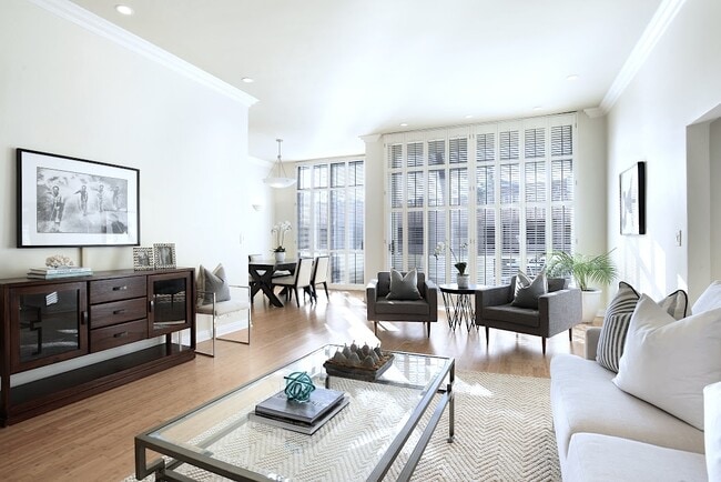 This Magnificent Corner updated front facing Penthouse located on Montana Avenue is filled with tons of sunlight and airy breezes boasting a large living room and adjacent dining with 18ft floor to ceiling sliding glass doors and two balconies. This elegant single level home has two very spacious bedrooms, each with their own attached bathrooms with granite counters, travertine tile flooring and rich wood finishes. Large kitchen with stainless steel appliances, granite counters and lots of storage. Magnificent bamboo floors, high ceilings, plantation shutters, central heating and air, tons of closets, crown and base moulding and two gated parking space and extra private storage are just a few of the added features. The security building has great curb appeal and offers a relaxing pool, sauna, and gym. Prime Brentwood location steps to Brentwood's finest shops, restaurants, farmer's market & Whole Foods make this residence an ideal place to call home.