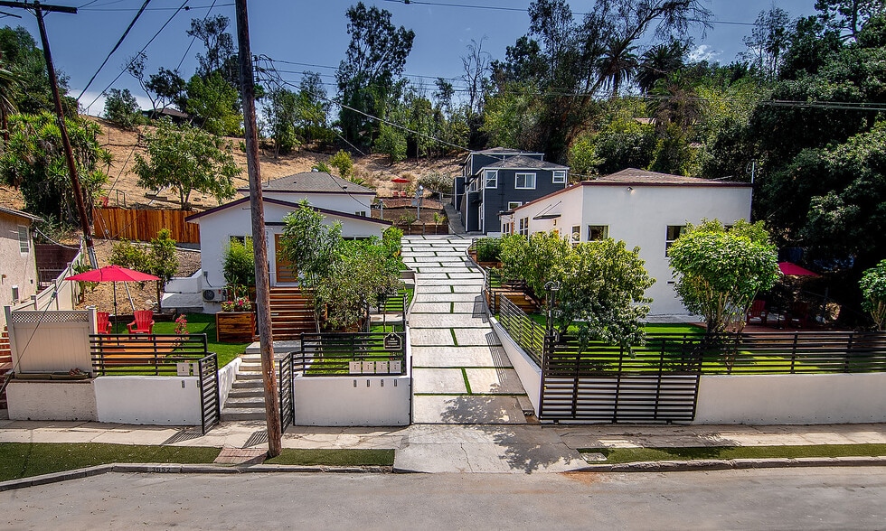 live & work in an amazing place and location. A very beautiful California cottage property has been transformed on a quiet tree lined residential street. Enter thru an architectural gate and pass down a private drive and walk towards the entry to this beautiful home. This is a gated and limited access property. Enter this light filled (big windows) home via your own redwood stairs and landing. This home has a wonderful living room & dining room, Modern designed kitchen (stainless steel, stove, stove hood, dishwasher & fridge) with large stone counters The bathroom has beautiful Carrera tile work, laundry with energy efficient stack washer and dryer, Tankless water heater and heating & air conditioning. There is an LED ceiling fan in the bedroom with nice closet space, LED lighting throughout the house, wide panel walnut doors with oiled bronze hardware. Wide panel engineered hardwood floors through the entire home, double pane energy efficient windows in the home. LED exterior lighting. A large private deck designed for outdoor entertaining and enjoyment. There is 1 car onsite parking behind gates. This apartment feels like a private home. The property sits on over 30,000 square feet of land with nice landscape features and installed custom artwork. This property is in the heart of Lincoln Heights revitalization, very close proximity to Keck USC, The Brewery, and everything the continuous revitalization of Downtown has to offer – entertaining, dining, theater, Disney Hall, Staples, LA Live, clubs, bars, local food