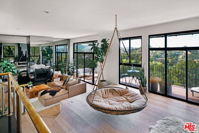 Perched high above the trees with no direct neighbors, this secluded modern home captures sweeping canyon and mountain views with sunsets that stop you in your tracks. Jaw-dropping. Cinematic. The kind of view that never gets old. Inside, an open floor plan unfolds beneath soaring ceilings and walls of glass, flooding the home with natural light from morning to dusk. A dramatic double-door entry, framed by a custom solid oak door and secondary glass entry, opens to an artful foyer finished in handcrafted Zellige tile. Smoked mirrored walls reflect the landscape beyond, amplifying light and depth throughout. The primary wing is expansive and private, complemented by two additional bedrooms and multiple living areas centered around dual fireplaces. Every finish has been thoughtfully selected. Bronze swan faucets. Designer hardware. Ambient lighting from Soho Home layered throughout. This is not a typical rental. It's curated architecture. The kitchen features newly updated appliances, including a new refrigerator, along with a whole-home Aquasana filtration system and reverse osmosis drinking water. A separate laundry area includes a new washer and dryer for added convenience. And tons of storage and walk in closets in every room. The primary bathroom feels like a private spa, complete with a soaking Jacuzzi tub overlooking the treetops. It's a space designed to unwind, reset, and take in the view in total privacy. Outdoor living is the headline. Expansive viewing decks provide front-row seating to canyon vistas and golf course greens below. Morning coffee in total quiet. Sunset dinners suspended above the trees. Absolute privacy. Solar panels with a backup battery system help reduce electricity costs while offering added reliability. A two-car garage with Tesla charger and additional driveway parking complete the functionality. Step outside your door and walk directly to the park and hiking trails. Within minutes, you're at the 101, Malibu, Casalena, grocery stores, and daily essentials. The serenity of Topanga with the convenience of the city. This is where light, privacy, and view come together. A home that feels like a retreat yet keeps you connected. Wake up above the trees. End your nights in color-soaked sunsets. Live somewhere that feels elevated in every sense of the word. MLS# 26657105