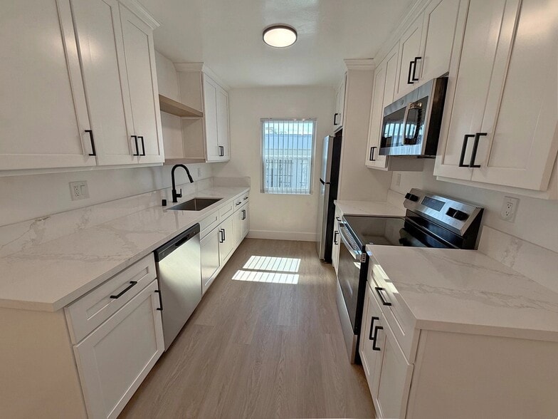 Unit Description: Top Floor Unit with a Private Balcony and Lots of Natural Light! Hardwood Laminate Floors Throughout with Recessed Lighting. Private Balcony! Kitchen with White Cabinetry, White Quartz Countertops with Gray Streaks, Stainless Steel Large Single Basin and Stainless Steel Appliances Included: Refrigerator, Electric Stove/Oven, Dishwasher and Microwave. Modern Finishes Throughout. Wall A/C in the Living Room. Bathroom with Large Vanity with White Quartz Countertop, Large Wall Mirror, Separate BathTub and Shower Stall. Lots of Closet Space. Bedroom with Ceiling Fan. Walking distance to trendy shops on Melrose Fairfax, The Grove and Farmers Market, Close proximity to West Hollywood, Beverly Hills, Los Feliz, Silverlake Hollywood and Downtown. Shared Laundry Room. Tenant Pays All Utilities - Including Pro-rated Share of Water and Trash (Rubs). 1 Parking Spot. Tenant Pays All Utilities 1 Parking Spot IT490306 - IT49st520NHayworth