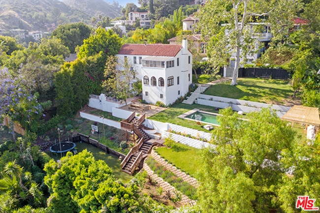 Hollywoodland Private 1923 historical Spanish retreat on a large double view lot. Fully furnished with a bohemian lived-in style. Renovated while retaining the original integrity. The kitchen features an 8-burner Wolf range, Sub Zero refrigerator, & marble counters. The open living room is anchored by a fireplace & has barreled ceilings w/archways. Light floods through the french windows that frame the expansive views. Upstairs each of the 3 bedrooms are unique & private. The primary suite has an exposed wood beam ceiling that carries through to the primary bathroom w/soaking tub. The sleeping porch doubles as an office & has some of the best views of LA. Additionally there is a guest suite w/separate entrance & full bathroom. The grounds take this property to the next level! Stairs, off the living area, lead to an open patio w/fountain. The adj alfresco dining area is a lovely place to socialize. The swimmers pool has a built-in hot-tub & baja shelf. The rear of the property has a large sport court area w/ fruit trees. Living in the Hollywood Hills with this much usable land is a true dream! MLS# 26643399