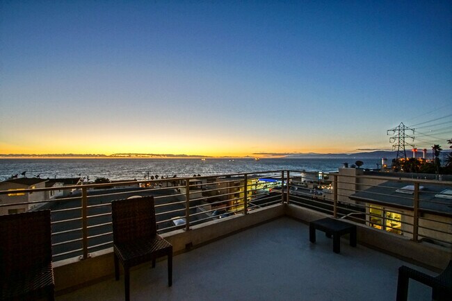 Panoramic Ocean and White Water Views accentuated by a sweeping sky scape from Palos Verdes to Malibu Peninsula. Features include a Gourmet Chef's kitchen with a professional Italian oven complimenting the high end appliances. Functional, attractive center island. Living room boasts a huge balcony, fireplace, private view work nook. Primary Bedroom features TV, Ocean View Balcony, fireplace and luxurious full bath. Three balconies. Water Softener/ reverse osmosis drinking water. Hardwood floors, recessed mood lighting, forced air AC/Heat, 3 car total parking, lots of storage. Close to all MB shops, restaurants and beach activities; Just steps to the beach. Guest/maids quarters, laundry room, extra closets, privacy, serenity and, of course, magnificent sunsets every night. This is a cool front row ocean view from most every room. Easy drive to all freeways, LAX, Silicon Beach and Santa Monica Bay. Great oasis in a special location. Delivered unfurnished only. This is absolutely inviting. (Security Deposit $10,500).
