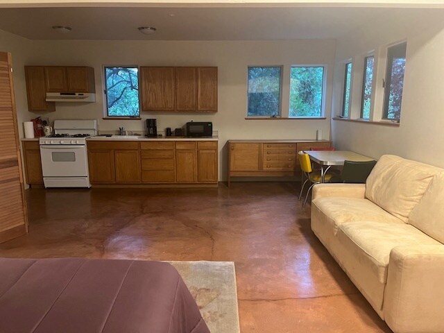 Furnished ADU: In-law studio/guest suite in tranquil Tam Valley neighborhood. Fourteen stairs lead to the studio’s separate entrance and deck. 550 square feet; 9-foot ceilings, nice natural light; walk-in closet; full kitchen with gas stove, oven and full-sized refrigerator; bathtub/shower. Close to Tam Junction, bike path and hiking. Off-street parking available for one small or midsize vehicle. Utilities included: PGE, water, garbage, WiFi. Month-to-month lease: ideal for long-term visitors, contract labor, recent transplants; and others in transition.