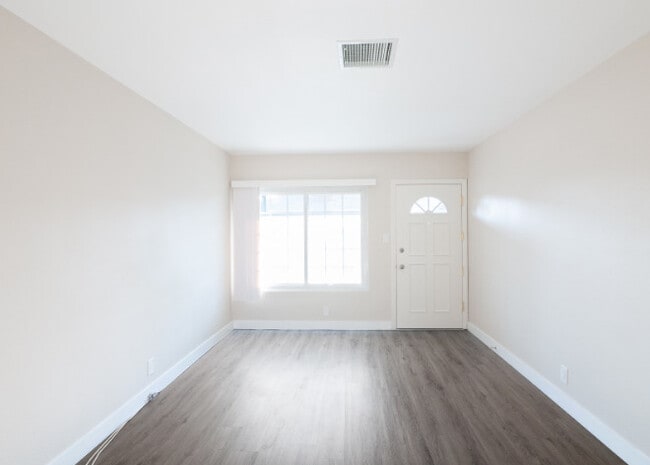 - Open living room with laminate flooring throughout