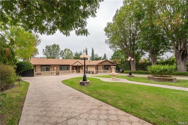 FULLY FURNISHED & sits on a huge 16,000 SqFt Lot. As you enter, you're greeted with a spectacular open floor plan with chandeliers all throughout, a formal dining and living room, tons of natural sunlight entering through the French doors, & new flooring and custom crown moldings. The gourmet kitchen is fully equipped with stainless steel appliances, double ovens, granite countertops, back splash, lots of cabinet space. Located off the kitchen is the spacious butler's pantry/laundry area and full bathroom. The garage has been converted to a bonus room that could serve as a 4th Bedroom or family room. Down the hall is the master bedroom that offers its own private bathroom, 2 other good-sized bedrooms with one that offers French doors leading to the patio, a full bathroom with a door leading to the patio, and a walk-in closet. The entertainer's backyard has a sparkling pool & spa with a waterfall and fire bowls, patio covering the outdoor kitchen and dining table, a fire pit with seating, a second custom-built kitchen with its own stove top, fridge and sink. Perfect to entertain everyone all year round!! The spacious circular driveway has room to fit all your cars & toys! This home truly has it all, sophisticated, well designed for the whole family. A true paradise! Conveniently located close to the 118 freeway, shopping, The Vineyards, CSUN, & so much more. Welcome home! >>
