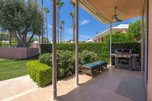 AVAILABLE Nov-Dec 2025. RENTED January-April,2026. Enjoy your unforgettable desert vacation in this spacious 3BR/3BA desert retreat home nestled in the iconic Marrakesh Country Club. Step through the grand entrance and be captivated by the spacious modern living area,adorned with soaring ceilings and notable fireplace adding Moroccan elegance into the space. Stackable walls of glass seamlessly connects indoors with outdoors offering expansive green belt and beautiful mountain vistas. Culinary enthusiasts will revel in the reimagined chef's kitchen,featuring custom stonework,an island,sleek cabinetry,and a wet bar,perfect for entertaining. Three well-appointed bedrooms are thoughtfully separated for privacy,with two luxurious suites complete with spacious walk-in closets and lavish bathrooms with floating vanities,glass showers,and freestanding soaking tubs straight out of a dream magazine. Indulge in unparalleled comfort with thoughtful amenities such as retractable awning,integrated Sonos sound system,dual Nest climate controls,and motorized screens. Convenience is key with this home's proximity to the community pool and spa,guest parking and easy access to club's amenities,including golf,tennis,pickleball and fine dining in the recently remodeled clubhouse boasting unparalleled views. Seasonal club privileges are available for renters (Social -$500/month,Golf (includes unlimited golf and social) - $2,300/month),making this exceptional retreat the ideal choice for reimagining your desert getaway.