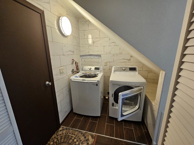 Kitchen, one bedroom, bathroom and laundry downstairs. Second bedroom, bathroom, living room upstairs.