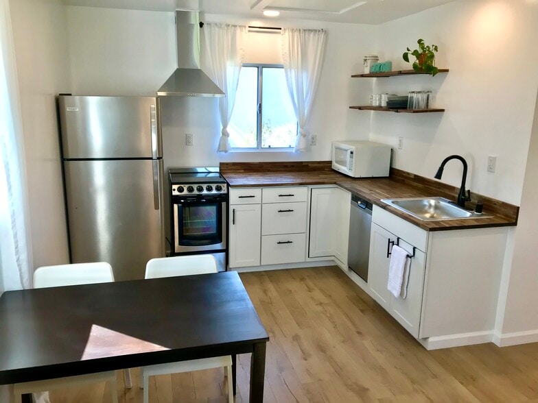 - Kitchen storage, microwave, oven, full-size fridge + freezer, dishwasher and sink