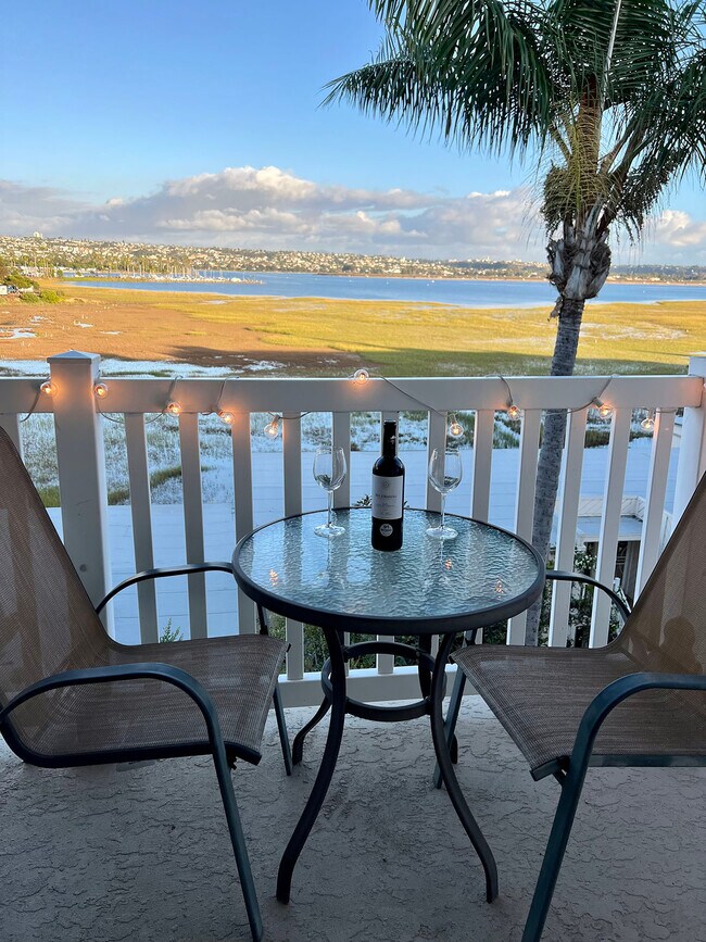 Bay front condo with amazing sunrises and panoramic views of Mission Bay, downtown, Sea World, & Fiesta Island. Waking distance to Crown Point beach/bay and bike path to ocean and Pacific Beach. Forever changing view as the tides come in and out of the estuary bird sanctuary/Kendall Frost Marsh. Only condo complex without a bike path in front of it for peace & quiet. Everything is close by and within walking & biking distance - grocery stores, restaurants, bars, banks, etc. This bright, spacious, quiet, fully furnished 3rd floor 1 bed/1bath unit with a balcony overlooking Mission Bay has a large living/dining room, large bedroom & closet, upgraded fully supplied kitchen, large walk-in shower in upgraded bathroom. Located in a secure luxury elevator building with laundry facilities on every floor, the unit comes with one assigned off-street parking spot. The complex has a heated community pool, hot tub, outdoor patio with tables & chairs, BBQ, gym, sauna & showers. 10-12 month lease.