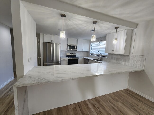 Just completed remodel an 886 sq ft luxurious quiet corner end unit with three entrances! This one bedroom condo has a brand new kitchen with new countertops and tile, all brand new stainless steel appliances, stove refrigerator, dishwasher microwave and trash compactor. Unit also includes a brand new stacked washer and dryer. Also there is a newly remodeled spacious bathroom and brand new luxury vinyl plank throughout the unit. Unit includes an attached garage! The spacious bedroom opens up to the patio and has a walk-in closet. All new window coverings and plenty of storage space. Access to the pool, Jacuzzi and tennis courts. This unit is close to everything and is available now! HOLIDAY SPECIAL $300 OFF OF FIRST MONTHS RENT!!!