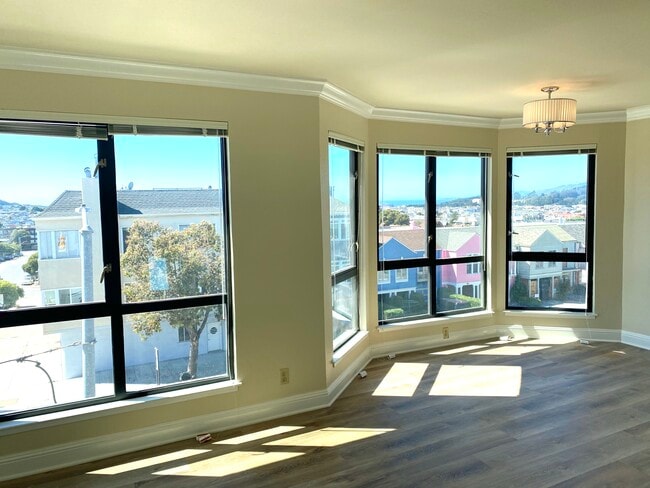 This is the one you have been waiting for....all new and remodeled! This unit is available now and has the following amenities: *new double paned, large windows *new kitchen with SS appliances, cabinets, countertops. *new hardwood flooring in living, dining, kitchen, hallway *new carpets in bedrooms * top floor, corner unit with three skylights *Large living room with bay windows *Dining area with bay windows *walk in hall closet *two bedrooms, each with large closets *two full bathrooms *No Pets, No smoking *One year lease *Views *coin-op laundry in the garage *Parking included *Owner pays for water and garbage *Walk to Geary Blvd, Koret Center and USF Campus *Security deposit $3900, No Smoking, No pets