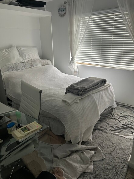 It is a small room and bath. The bed is a new murphy bed with a new mattress. The condo is 1200 square feet and very small. As such I am asking that only the tenant be present in the condo (no friends) due to the size. It is a very quiet and safe neighborhood. Close to the freeway and stores.