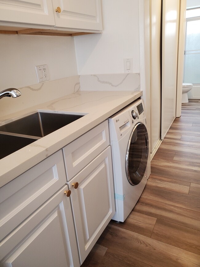 THIS UNIT HAS A WASHER/DRYER IN THE APARTMENT. PROBABLY THE ONLY ONE BEDROOM IN TOWN THAT HAS ONE. great location 1 block from Montana Ave shops, restaurants and more and the beach. Laminate flooring throughout. Private balcony. Tuck under parking. Must see.