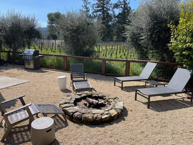 The outdoor space embraces the best of Wine Country living. The front garden features seasonal raised beds, citrus trees (including Meyer lemons and kumquats), and a welcoming outdoor dining area under a covered patio with a firepit. Relax while overlooking the vines.