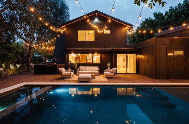 A rare, fully furnished gem in Studio City, this modern A-frame masterpiece showcases brand-new contemporary interiors and a distinctive layout designed for seamless indoor-outdoor living. The property features multiple outdoor entertaining areas, including a pool, jacuzzi, and firepit. An attached guest house with a private entrance offers versatility, serving as a fifth bedroom, office, gym, or recording studio. The main residence includes four spacious bedrooms and three and a half bathrooms, while the guest house is equipped with a full bath, separate entry, and dedicated parking. Available May 1st. Furnished prices may vary.
