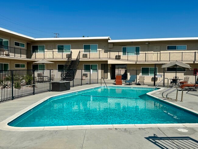 Clean complex with pool and outdoor dining areas.