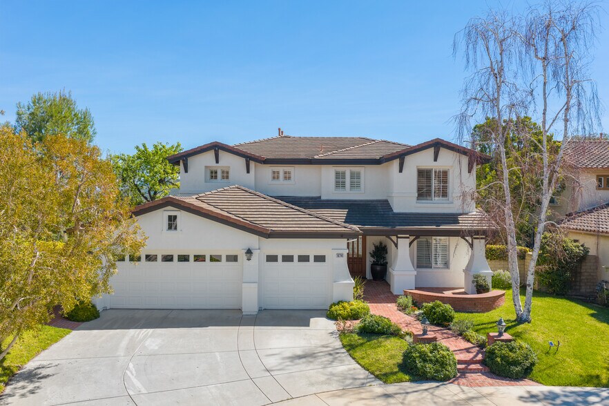 Welcome home to this private, spacious, and beautifully upgraded residence located on a quiet cul-de-sac in the highly desirable Dos Vientos community of Newbury Park. This stunning home offers 4 large bedrooms and 3.5 bathrooms, including a downstairs en-suite bedroom, plus a versatile second-floor bonus room that can easily serve as a fifth bedroom, home office, or media room. Designed with both comfort and style in mind, the home features a grand entryway that opens to a formal living room and elegant dining room perfect for hosting gatherings and entertaining guests. The well-appointed kitchen, complete with stainless steel appliances, opens to a warm and inviting family room highlighted by a cozy fireplace.The expansive primary suite serves as a peaceful retreat, featuring a spacious bathroom, large walk-in closet, and stunning views of the surrounding open space. Plantation shutters throughout add timeless charm and privacy, while recessed lighting enhances the home's bright and welcoming ambiance.Step outside to a beautifully landscaped backyard where you can enjoy panoramic, elevated views of the Conejo Valley and iconic Boney Mountain the perfect setting for relaxing, entertaining, or simply taking in the scenic natural beauty that defines the Dos Vientos lifestyle. Additional highlights include a three-car finished providing abundant storage and workspace. The home is also equipped with solar panels, offering the benefit of reduced electricity costs. Ideally located near parks, hiking and biking trails, excellent schools, and convenient shopping and dining, this exceptional home offers the best of the Dos Vientos lifestyle.