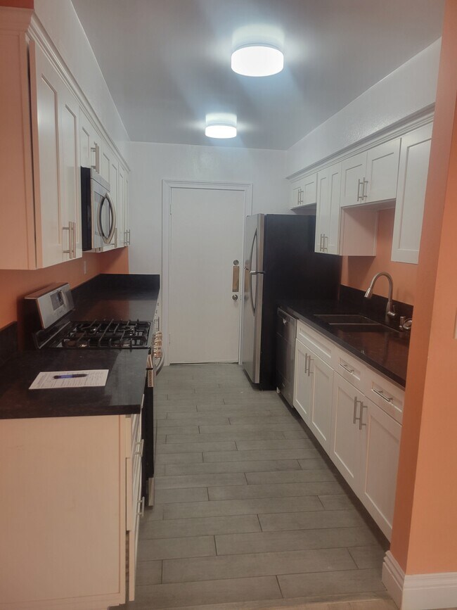 Large 1 + 1 in prime location on Corteen and Magnolia. Totally and very tastefully redone with beautiful kitchen appliances, granite countertop, hardwood floors, beautiful bathroom with a private little back yard. One parking space. Building has a beautiful large pool. The apartment door is just a few feet to the pool. Former tenant has just left this orange color on the walls. Please be aware that unit is being painted or will be painted with a silver greyish color which is very beautiful and soothing. Unit has plenty of closet space and is very spacious as well. Laundry on premises!